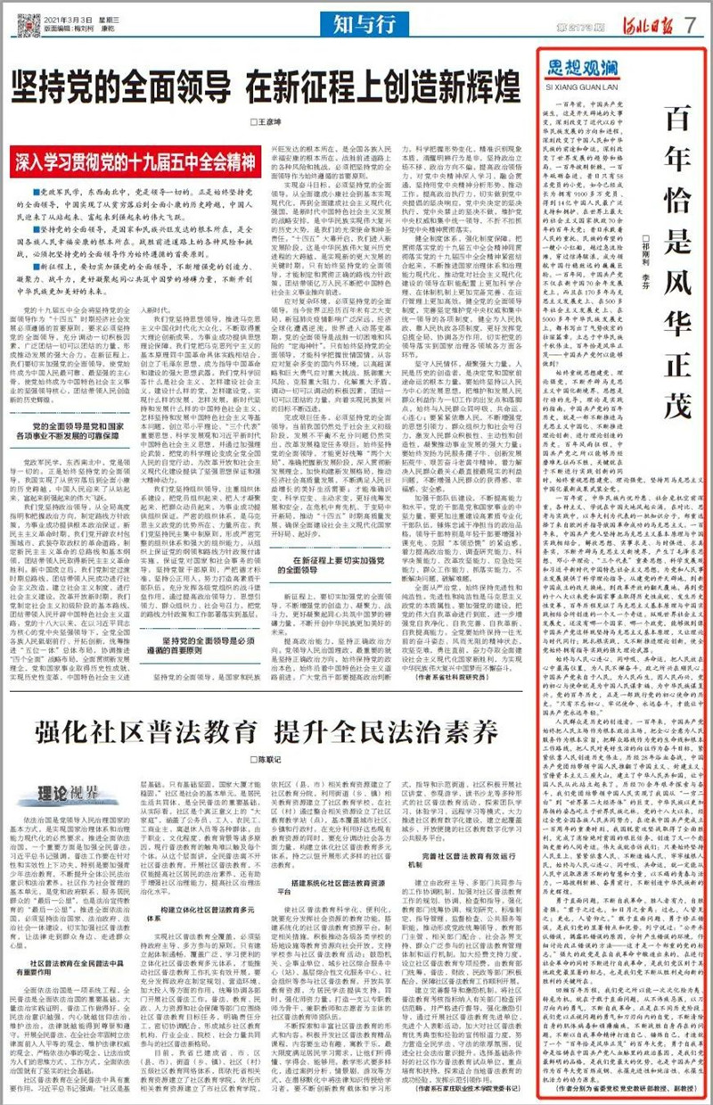 3月3日,省委党校(河北行政学院)党史教研部主任、教授祁刚利,副教授李芬在《河北日报》7版《知与行》发表署名文章《百年恰是风华正茂》。一起来学习一下!