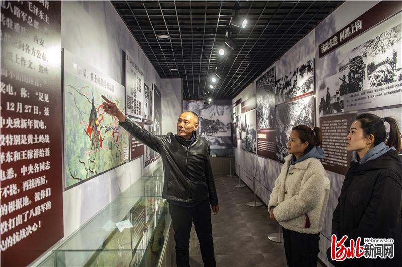 4月6日,在黄土岭战斗遗址的纪念展室,黄土岭村党支部书记兼村主任陈成(左一)向前来参观学习的涞源县华中集团员工讲述黄土岭战斗过程。 河北日报记者田明摄
