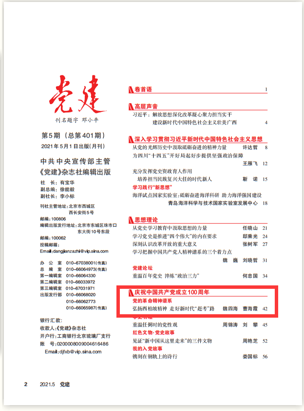 5月1日,省委党校(河北行政学院)常务副校(院)长魏四海、中共党史教研部讲师曹海霞在《党建》杂志第5期 (总第401期)发表署名文章《弘扬西柏坡精神 走好新时代“赶考”路》。一起学习一下!