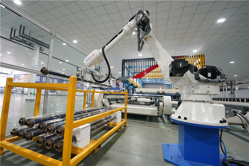 在威县高新技术产业开发区,一家清洁能源产品生产企业车间机械手在搬运太阳能集热管。 新华社记者 骆学峰 摄