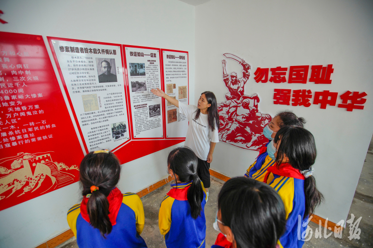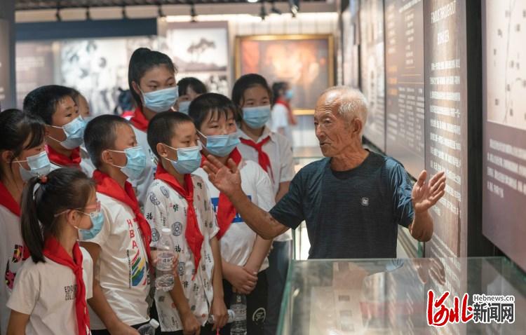 2021年9月2日,河北省黄骅市大赵村惨案遗址纪念馆的讲解员在向学生们讲述抗战故事。