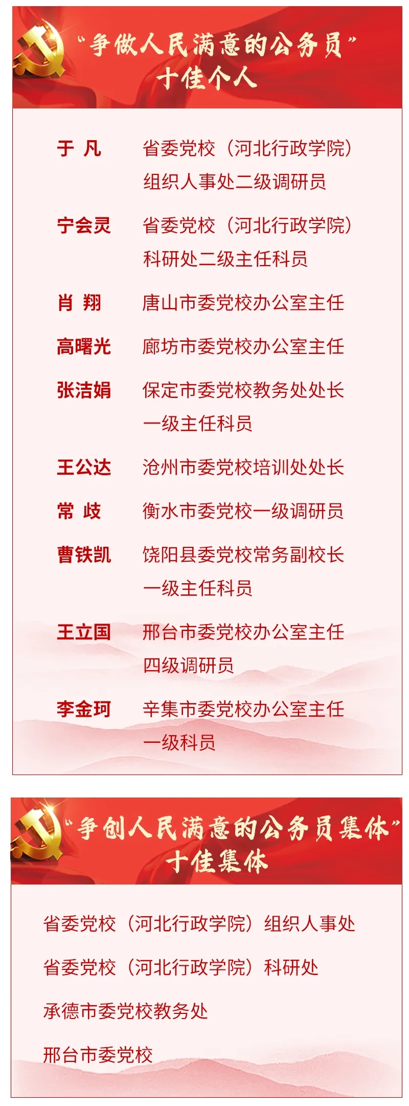 近日,省委党校(河北行政学院)印发通报,公布了2020年度全省党校(行政学院)系统“争做人民满意的公务员”十佳个人和“争创人民满意的公务员集体”十佳集体(简称“双十佳”)。本次“双十佳”选树活动经过广泛动员、积极选树、严格审核、集体研究、公示及省委组织部审批备案,选出十佳个人10人,十佳集体4个。