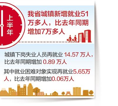 上半年,我省城镇新增就业51万多人,比去年同期增加7万多人。城镇下岗失业人员再就业14.57万人,比去年同期增加0.89万人,其中就业困难对象实现再就业5.65万人,比去年同期增加0.06万人。6月末,城镇登记失业率为3.48%,比一季度回落0.01个百分点,控制在全年4.5%计划目标以内。