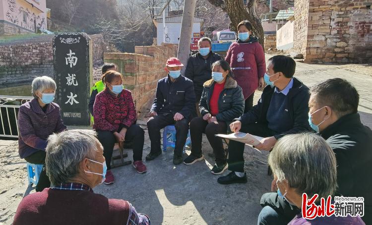 2021年11月25日,在河北省邢台市信都区白岸乡南就水村军工厂旧址前,“小马扎”宣讲员为当地群众宣讲党的十九届六中全会精神。