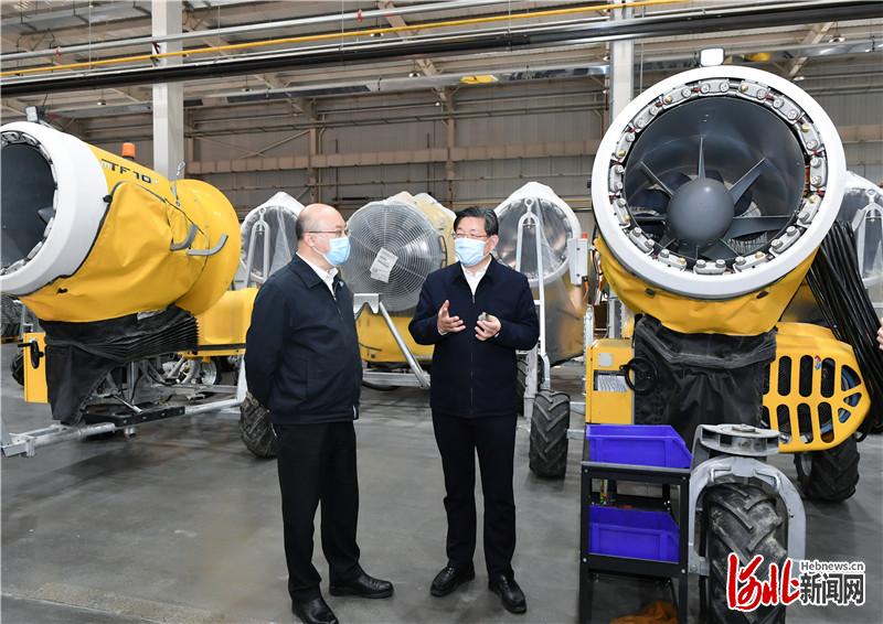 在张家口冰雪运动装备产业园,王东峰、王正谱先后到宏威运动用品制造(张家口)有限公司、天冰冰雪设备张家口有限公司,认真察看冰球鞋、造雪机等生产情况。王东峰强调,要充分发挥张家口市比较优势,扎实推进产业链招商、产品配套招商,加快冰雪装备制造产业发展。要始终把自主科技创新作为第一动力,加大科技研发力度,全面提升冰雪装备制造业水平。要按照产城融合要求,高水平高质量规划建设产业园区,打造城市建设亮点和产业发展高地。