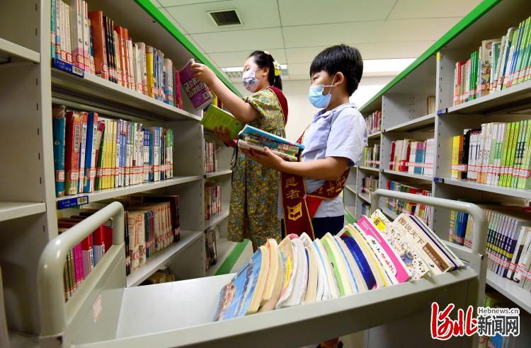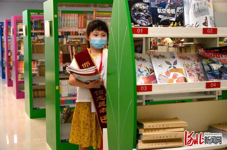 2022年7月12日,在河北省邯郸市图书馆,小图书管理员在整理图书。