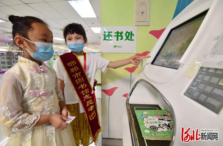2022年7月12日,在河北省邯郸市图书馆,一名小图书管理员向小读者介绍还书流程。