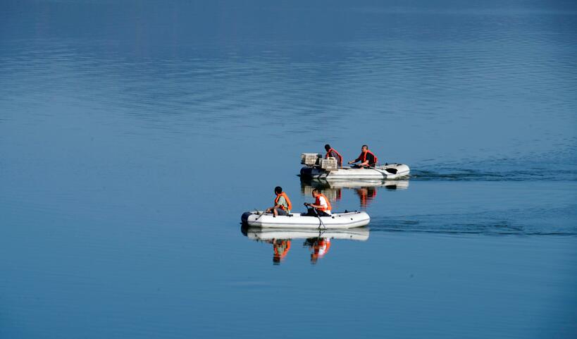 7月18日,专业打捞队员划船行驶在河北省遵化市龙门湖,准备进行打捞作业。 新华社发(刘满仓摄)