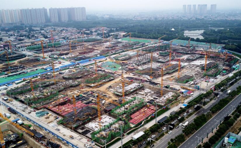 7月18日,中铁二十局的工人在石家庄市高新技术产业开发区集中安置区棚户区改造项目工地施工(无人机照片)。 新华社记者杨世尧摄