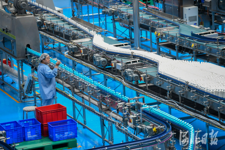 7月16日,在丰宁满族自治县朴诚乳业承德有限公司灌装车间,工人在生产线上忙碌。河北日报记者田明摄