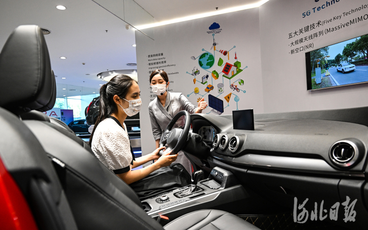2022年7月15日,位于河北省保定市的长城汽车技术研发中心内,工作人员在为参观者讲解智能网联汽车技术。