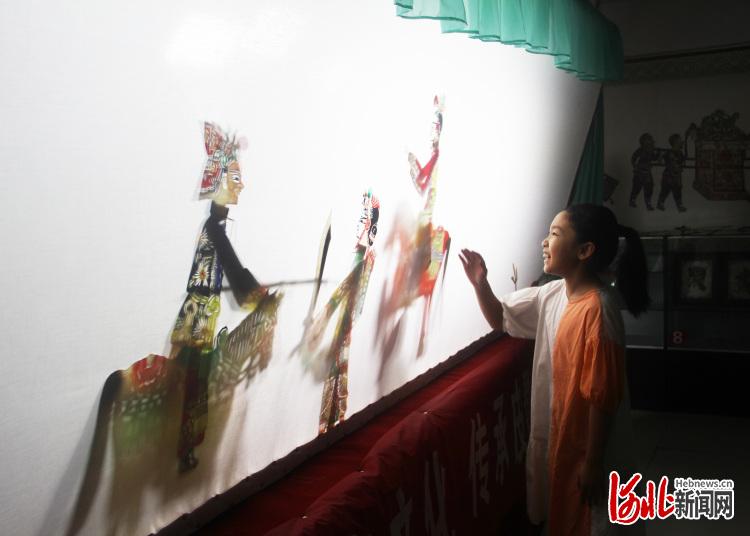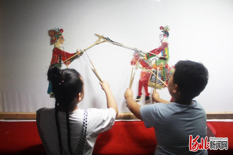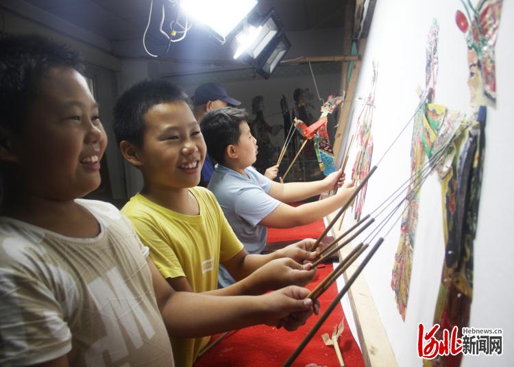 7月25日,小朋友们在河北省唐山市丰润区文化馆体验皮影戏表演。