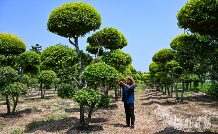 在河北晨清农业科技有限公司苗木基地,工人正在修剪苗木。定州市农业产业提质增效,苗木花卉产业年销售收入达57亿元。