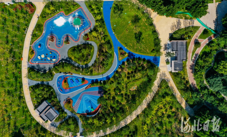俯瞰时代公园儿童活动中心。定州市按照“应绿尽绿、能绿则绿、拆围植绿、见缝插绿”原则,优化国土绿化空间布局,新增18个公园,城市更加靓丽。