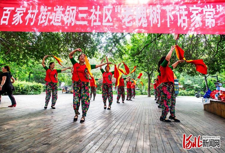 2022年7月27日,河北省邯郸市复兴区百家村街道钢三社区百五小区,辖区居民在提建议话家常前先来段广场舞热身。