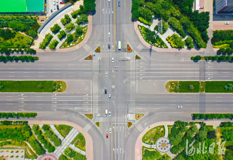 绿意点缀的澳森大街与教育路交口。澳森大街两侧各建有88米的绿化带,让这条大道真正成为了城市的“绿廊通道”。