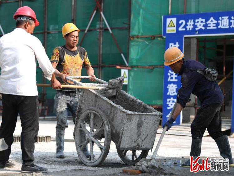 2022年8月3日,在河北省张家口市怀来县沙城镇某建筑工地,工人们正在一线施工现场忙碌。