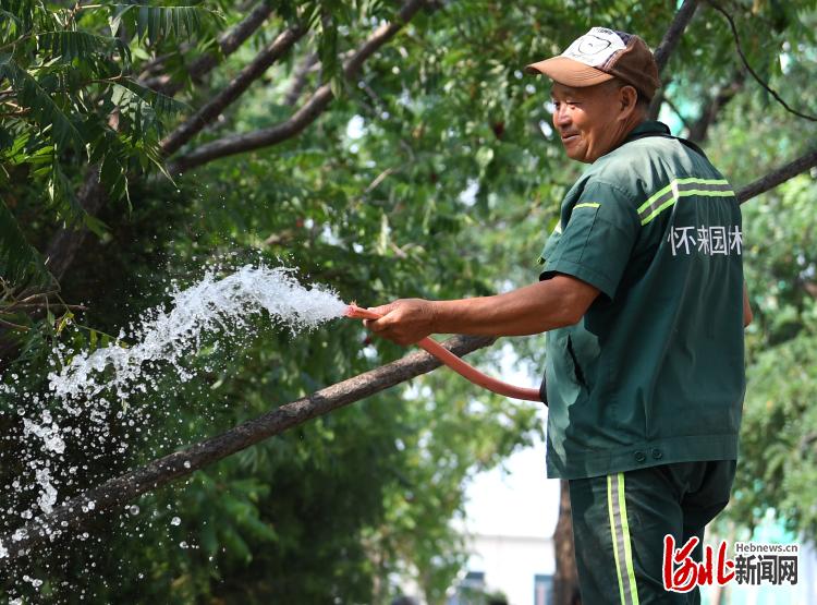 2022年8月3日,在河北省张家口市怀来县沙城滨河公园,园林工人正在给树木浇水。