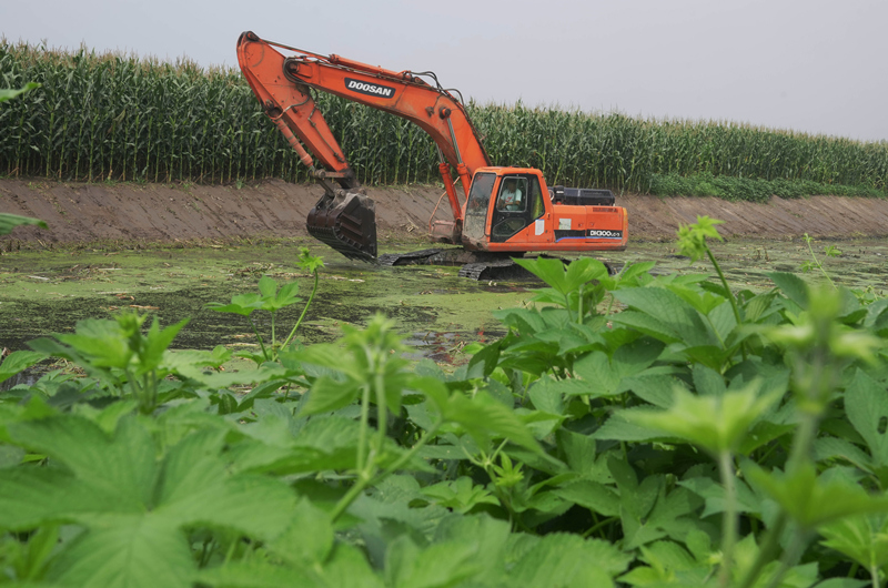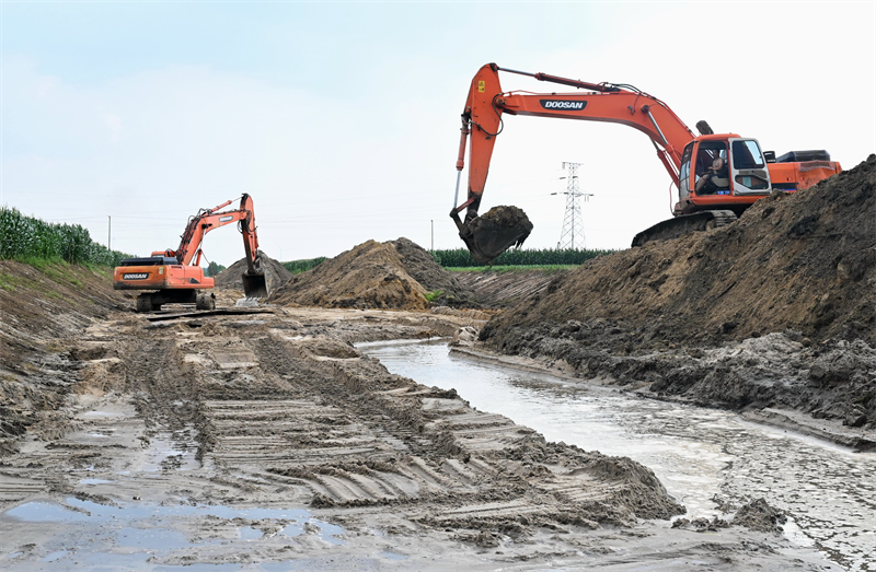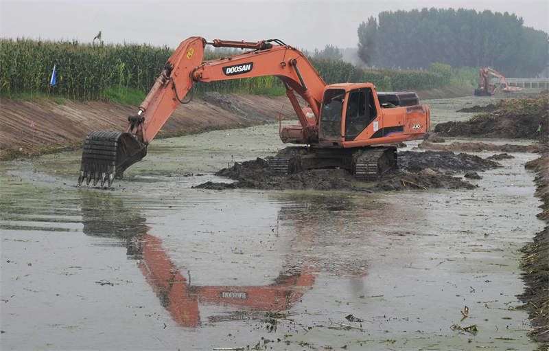 8月6日,工人在昌黎县新集镇境内的引滦河水灌渠清淤现场施工。新华社记者 杨世尧 摄