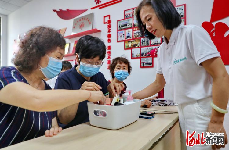 2022年8月15日,河北省秦皇岛市海港区秦皇半岛第二社区,家政培训教师为居民讲解生活用品整理收纳技巧。