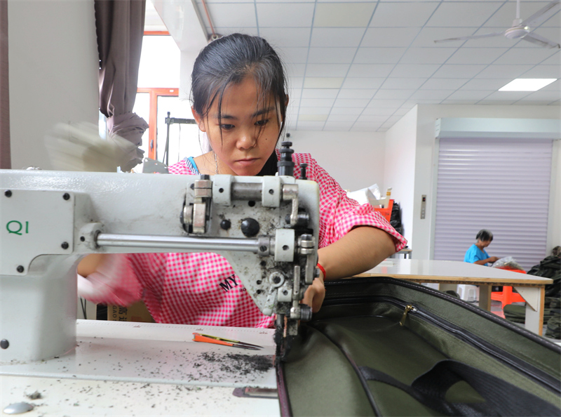 8月15日,在固安县马庄镇林子里村一家箱包加工点,一名工人在加工箱包。新华社发(门丛硕 摄)