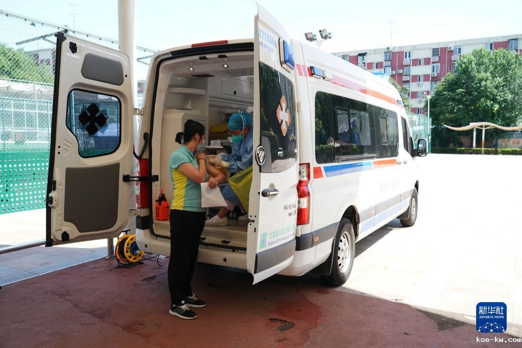 2022年7月13日,在北京市海淀区北下关街道中国农业科学院社区新冠疫苗临时接种点,医护人员在流动疫苗接种车上为社区居民接种。新华社记者 任超 摄