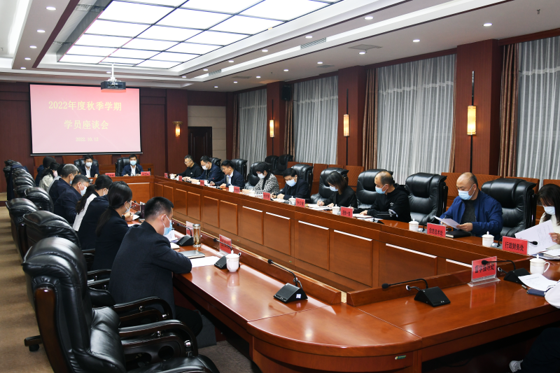 为切实了解学员入校以来的学习生活情况,推进教学运行、学员管理、后勤服务和信息化保障等工作的提质升级, 10月12日,省委党校(河北行政学院)召开2022年度秋季学期学员座谈会,副校(院)长李胜茹、张月军出席,教育长李凤瑞主持。市厅级干部进修班、中青年干部培训班、县处级干部理论研修班、乡镇(街道)党(工)委书记进修班的12位学员代表及中青班督学、校(院)相关单位主要负责同志参加了会议。