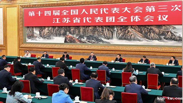 3月5日下午,习近平总书记来到他所在的十四届全国人大三次会议江苏代表团参加审议。 人民大会堂东大厅灯光璀璨,暖意融融。回字形的会议桌旁,代表们踊跃发言,总书记用心倾听。